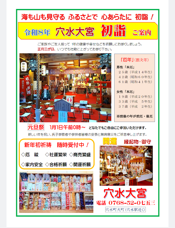 北陸は能登半島、石川県鳳珠郡穴水町大町に鎮座し、延喜式内社の辺津比咩神社(へつひめじんじゃ)と知られ、穴水大宮(あなみずおおみや)として尊敬され、神の最高位(正一位)の神を祀り、長い歴史と伝統ある式内社を誇っております。初詣や七五三の参拝は、能登有数であります。